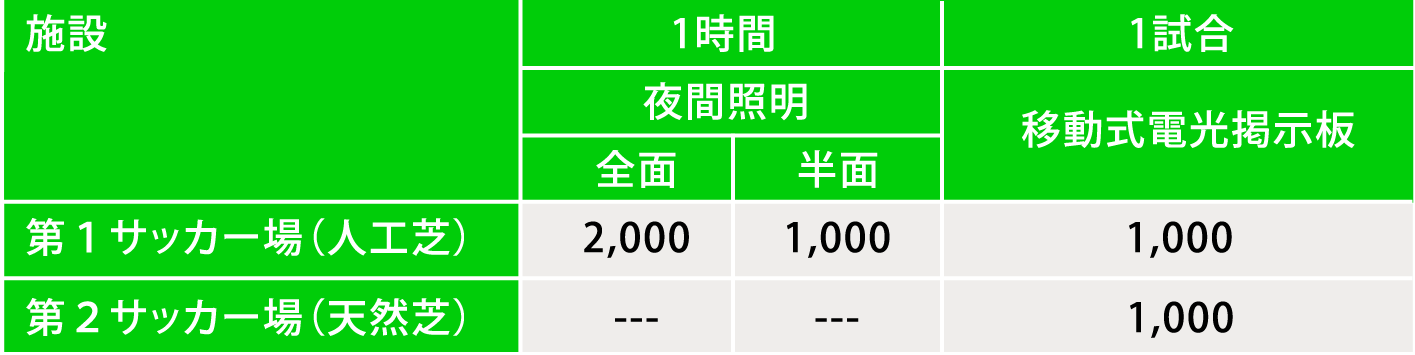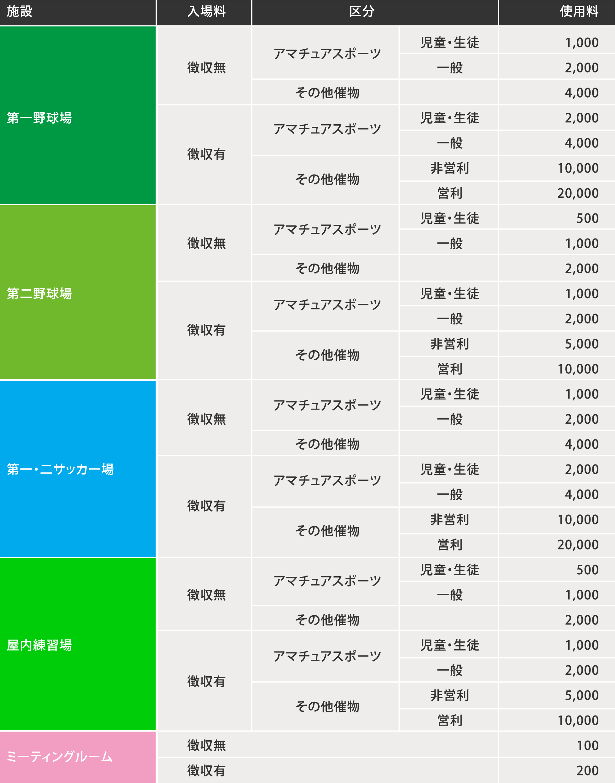 ・「入場料を徴収する場合」とは、入場料、会費若しくはこれらに類する料金を徴収する場合又は営業の宣伝その他これに類する目的をもって催しを行う場合をいい、「入場料を徴収しない場合」とは、それ以外の場合をいう。 ・9時前又は21時後の使用料の額は、1時間につきそれぞれ普通使用料の額に100分の120を乗じた額とする。 ・第一サッカー場及び第二サッカー場を半面使用する場合の使用料の額は、それぞれ普通使用料の額に100分の50を乗じた額とする。ただし、設備に係る使用料を除く。 ・入場料を徴収する場合の設備の使用料の額は、それぞれに定める額の2倍の額とする。 ・1時間未満の端数があるときは、30分以上は1時間とし、30分未満は切り捨てる。