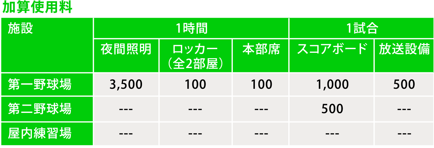 ※ロッカーは、1塁側・3塁側で各部屋100円 ※本部席と、スコアボードはセット ※営業時間外の使用料は1.2倍